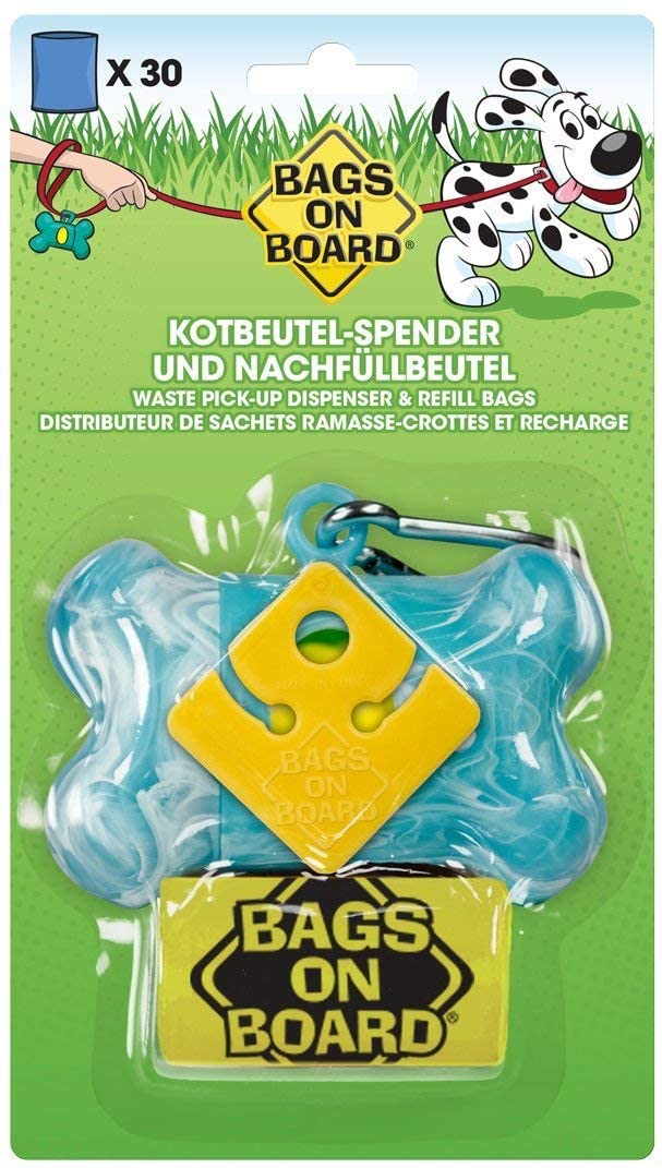 Bags on Board bone shaped, poop bag dispenser with 2 rolls of 15 refill bags.