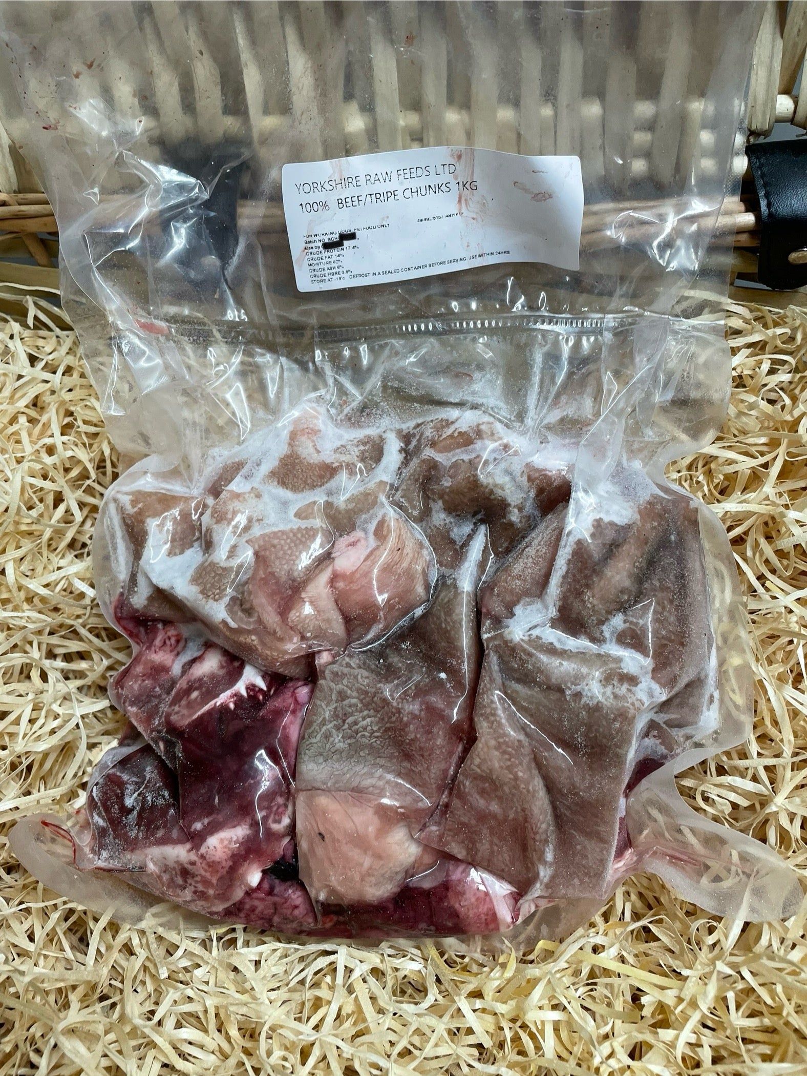 A 1kg (approx) bag of raw, frozen beef (including beef lip) and tripe chunks.