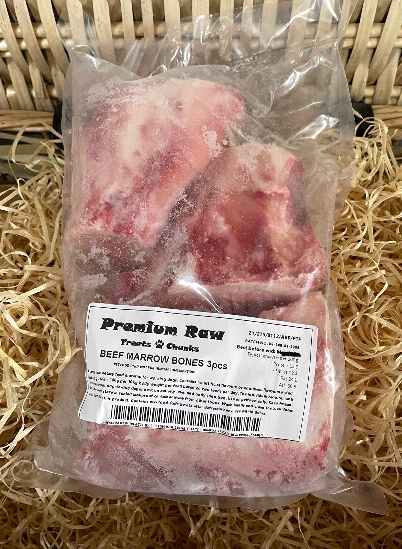 Raw, frozen, beef Marrow bones. Ideal for making a tasty, nutritious bone broth, as well as providing a tasty raw bone snack.