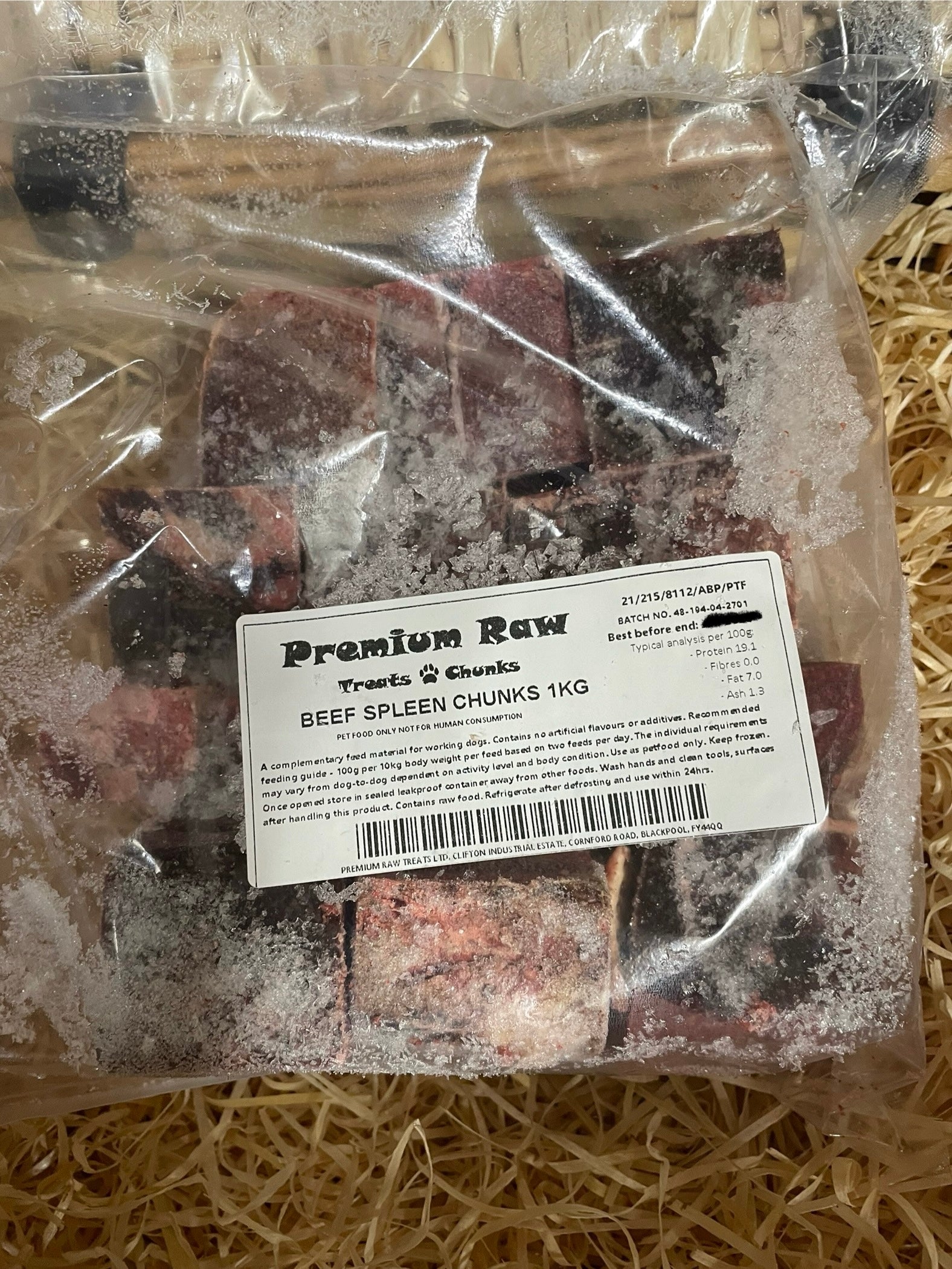 A dog's diet should consist of 10% offal from a secreting organ, of which 5% should be liver. Spleen is ideal for the second 5%.