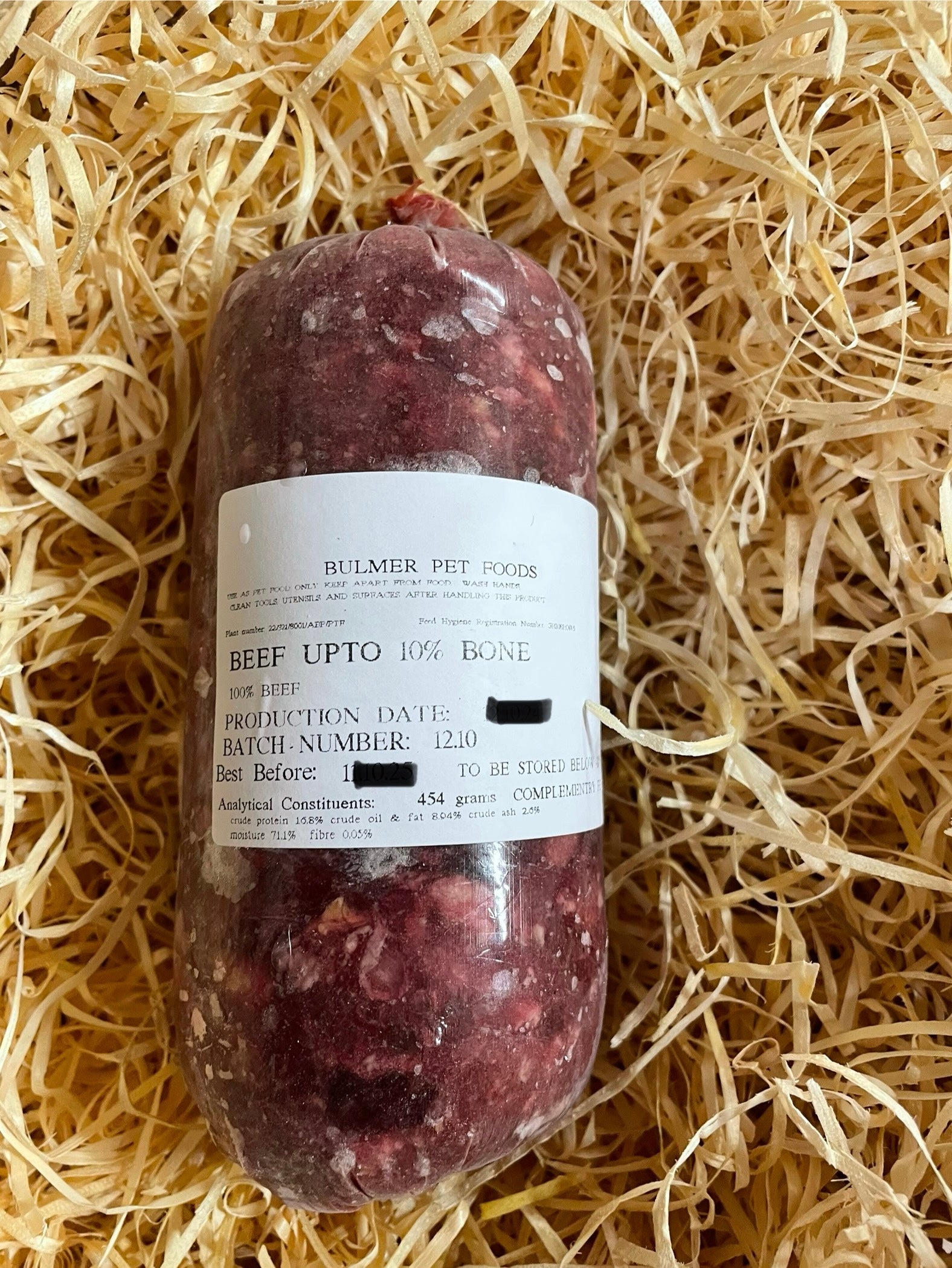 100% Minced Beef with 5 -10% Bone. No Offal. Each roll is approximately 454g. Contains small pieces of bone.