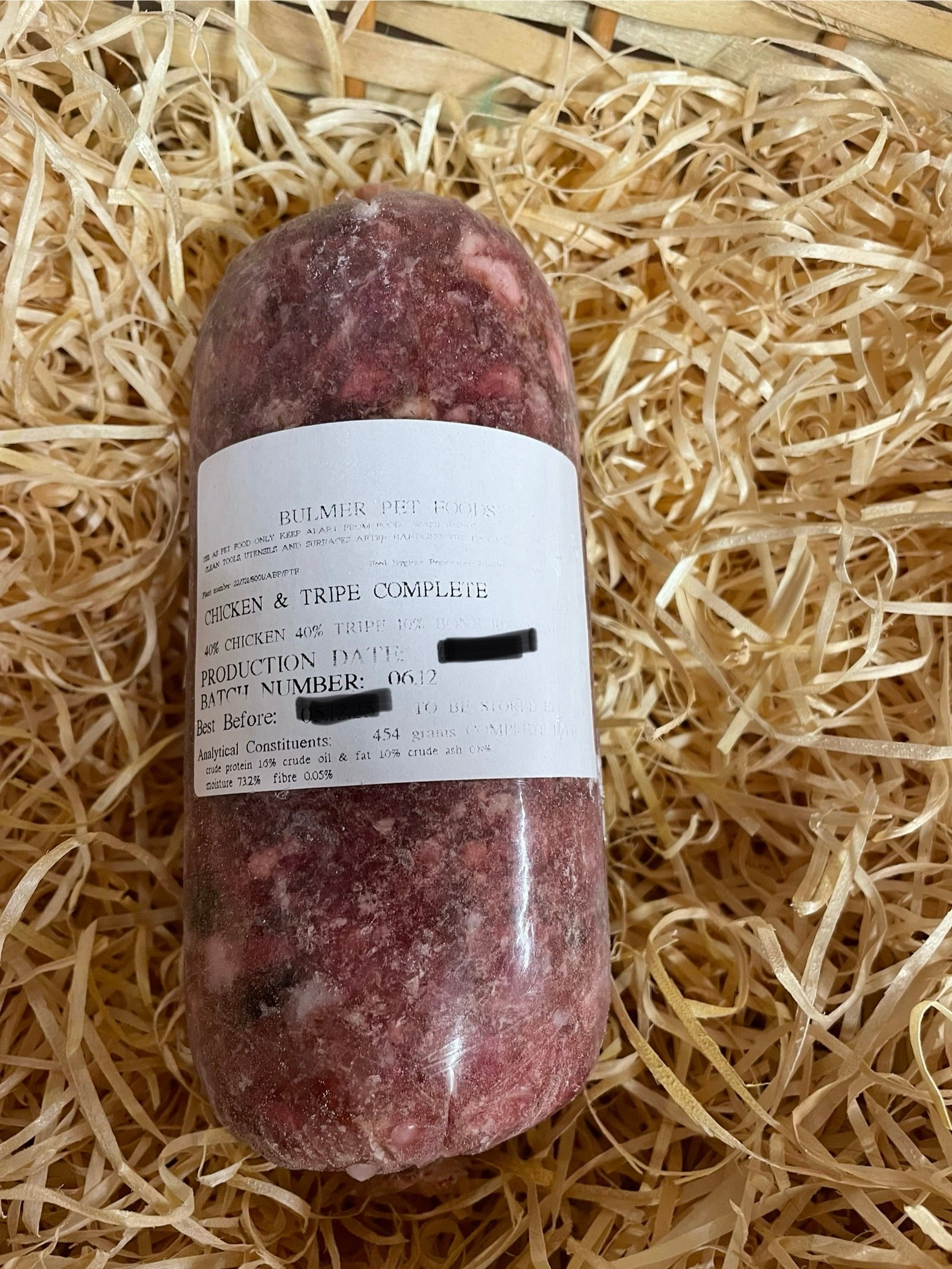 80% Chicken Mince and Beef Tripe Mince with 10% Bone and 10% Beef Offal. Each roll is approximately 454g. Contains small pieces of bone.