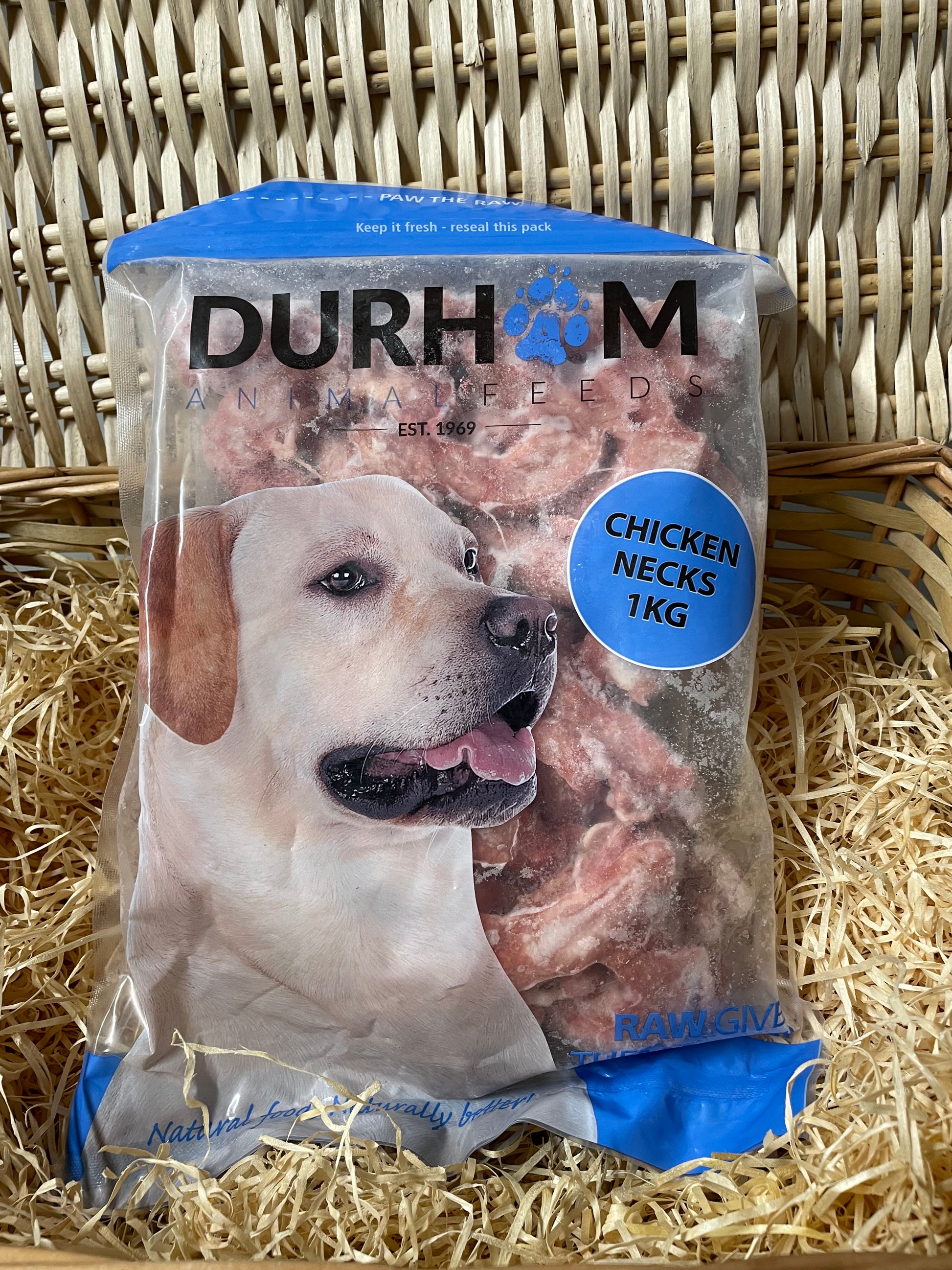 A 1kg or 2kg (approx) bag of frozen, raw chicken necks.