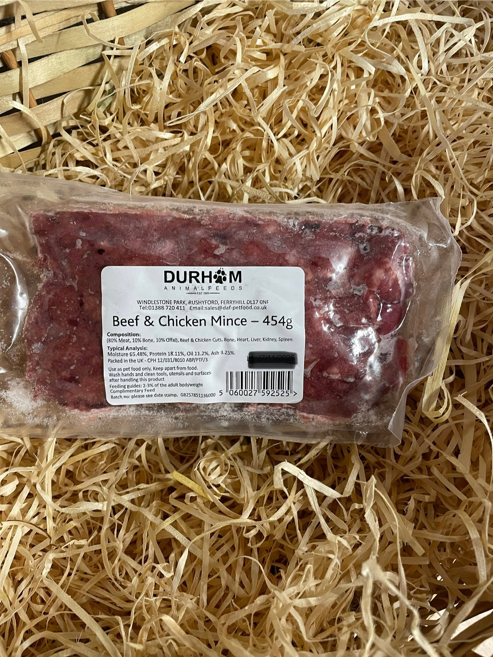 DAF Beef and Chicken 80/10/10 Mince. Each pack is approx 454g. Contains pieces of bone.