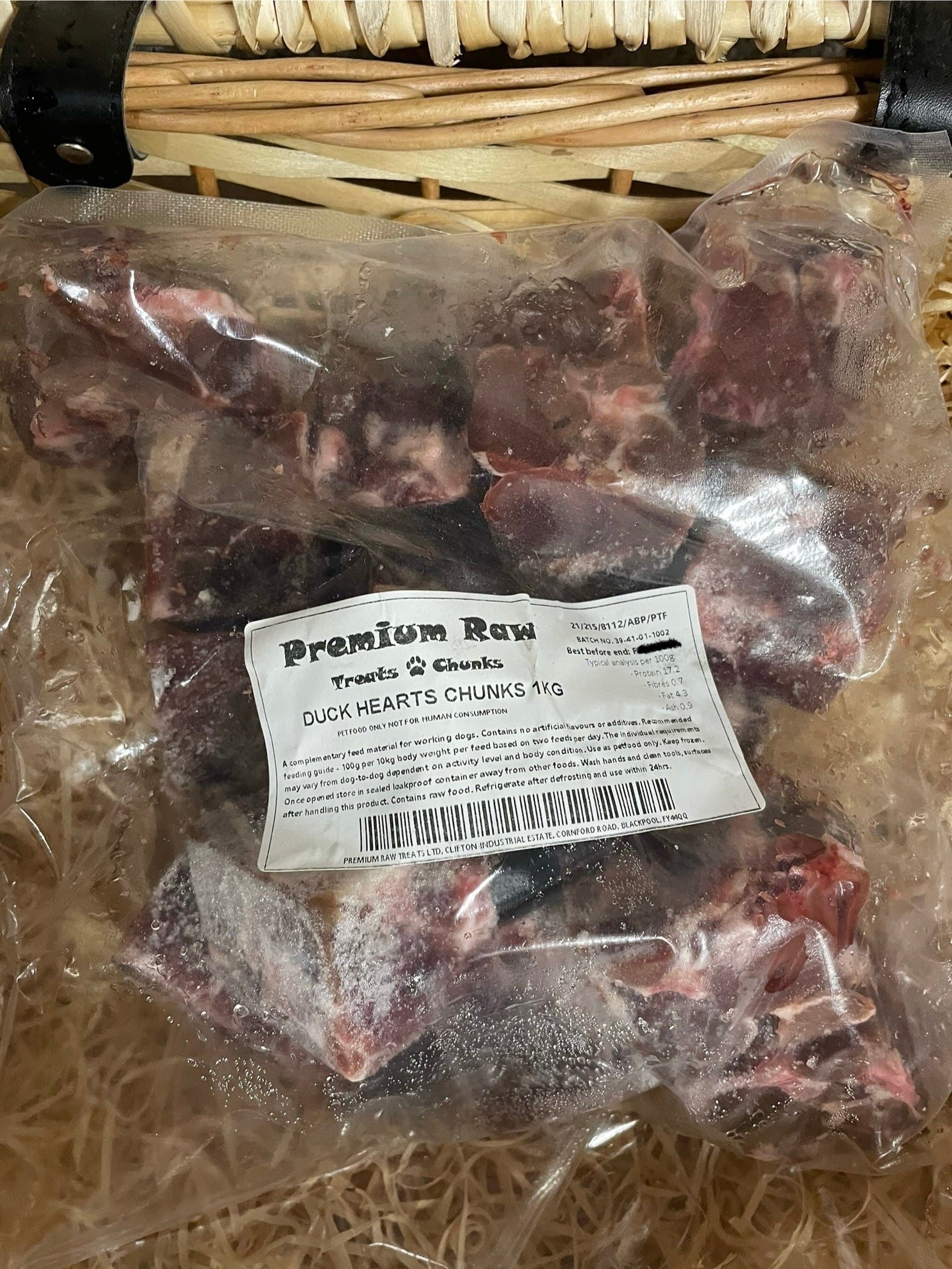 Approx 1kg of raw, frozen duck heart chunks. Premium Raw Treat & Chunks.