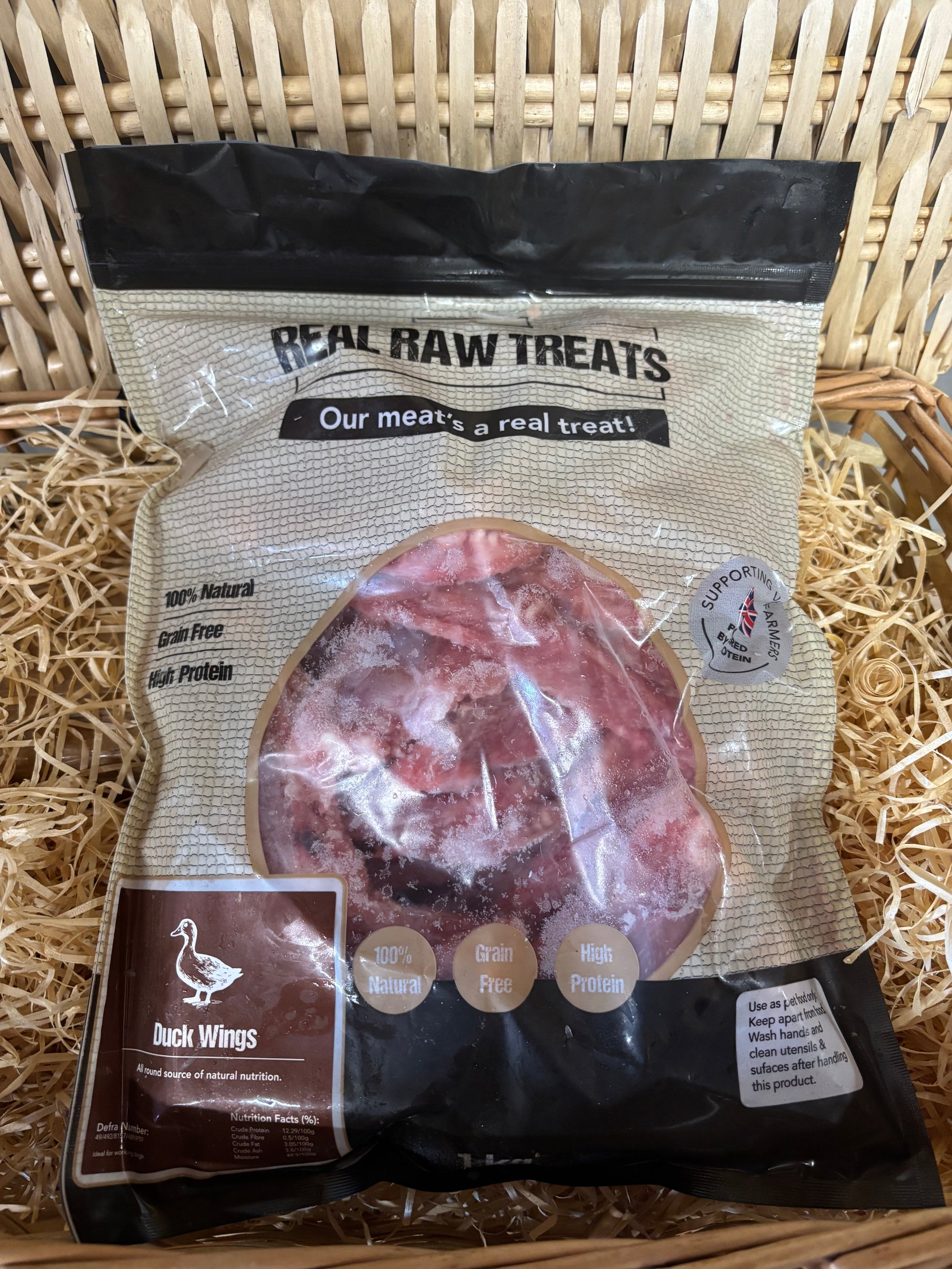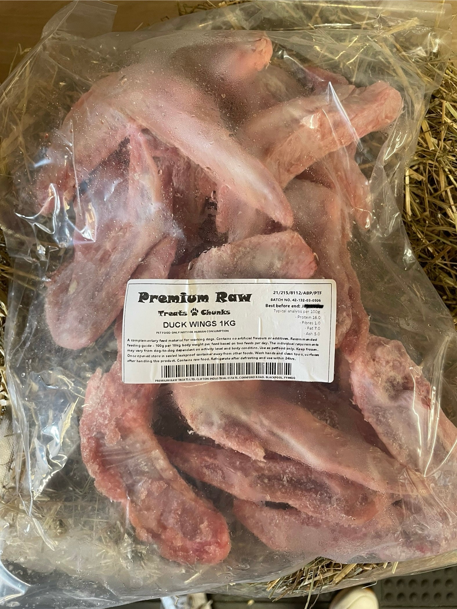 A 500g or 1kg (approx) bag of frozen, raw duck wings.