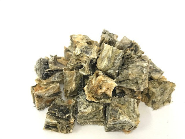 Dried Fish Skin Cubes. Contains omega 3 & 6 fatty acids for healthy skin and coat & are great for joints and bones.