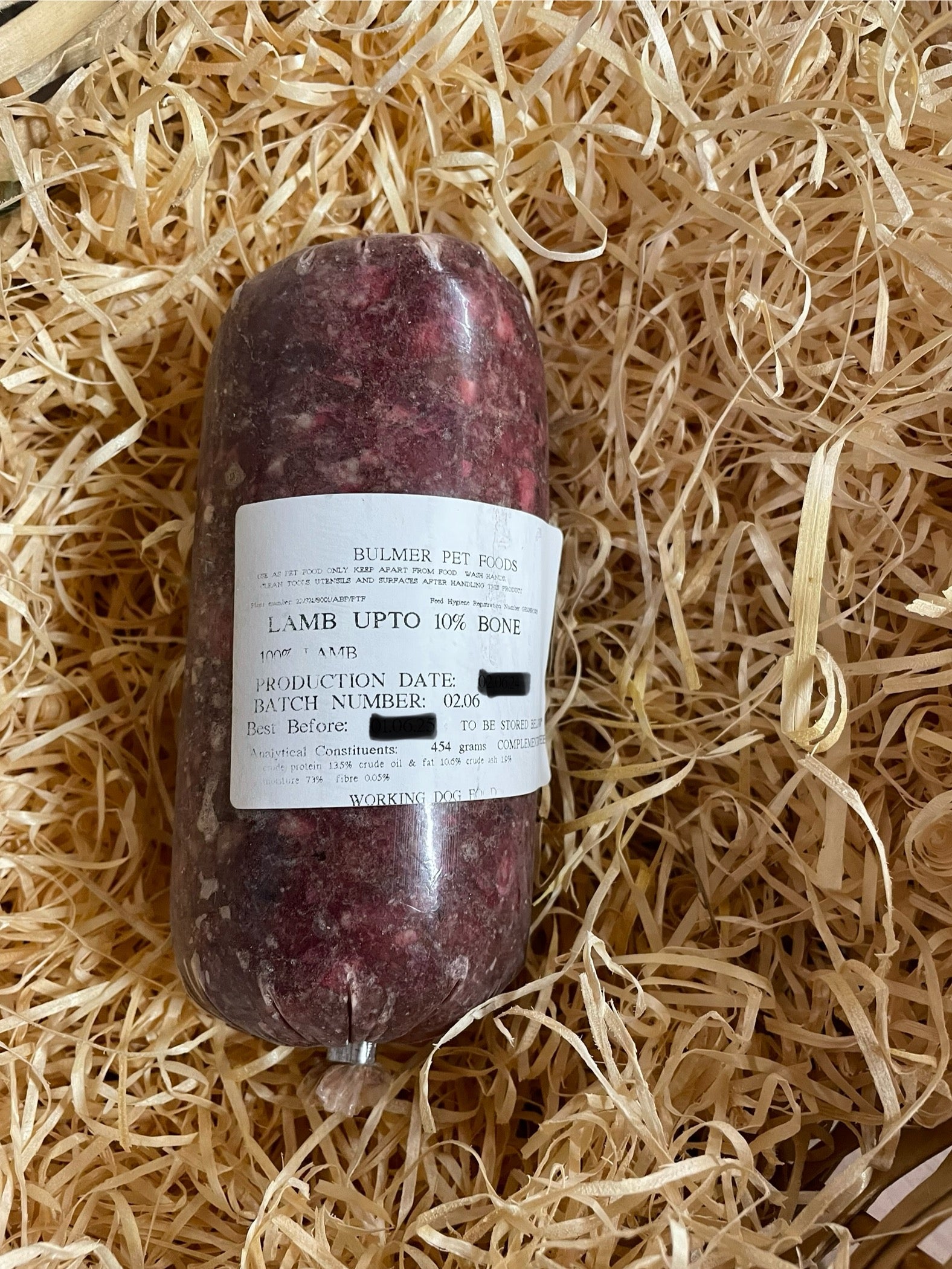 100% Lamb Mince with 5-10% Bone content. No Offal. Each roll is approximately 454g. Contains small pieces of bone.