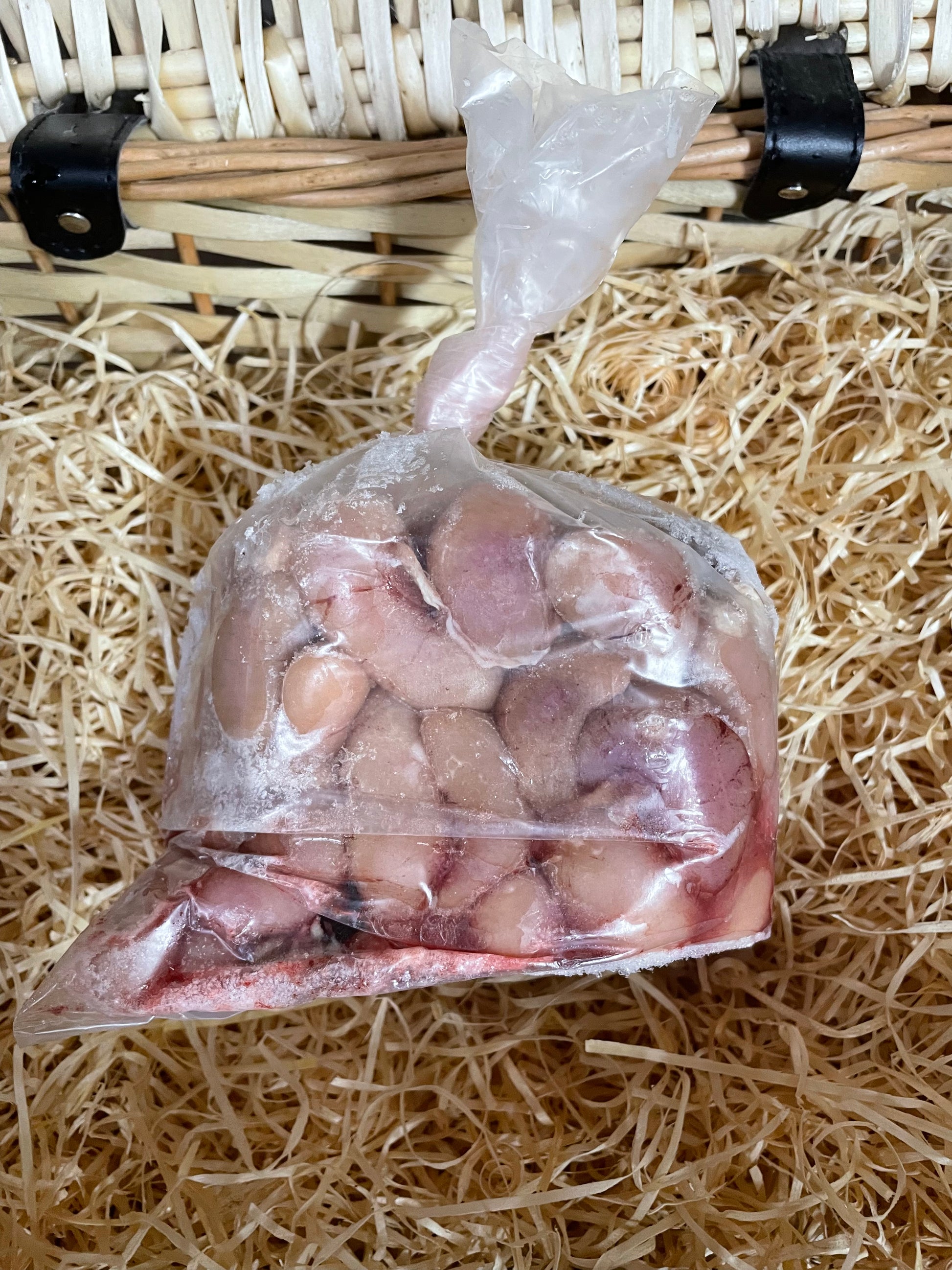 Approx 1kg of raw, frozen Turkey Fries (testicles). Premium Raw Treat & Chunks.