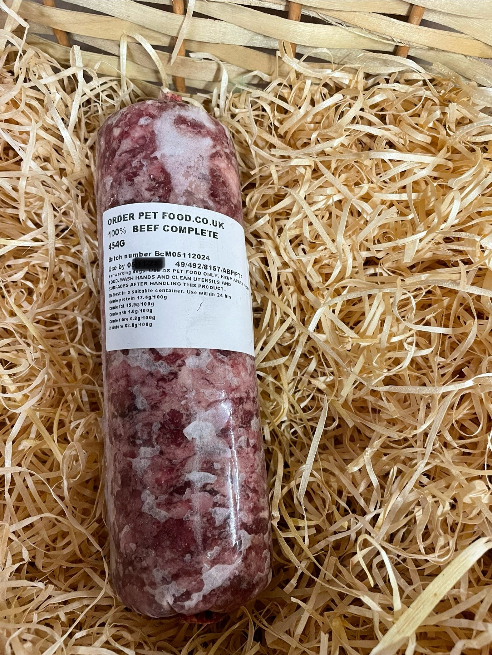 Single protein - 80% best beef muscle meat with 10% offal and 10% bone mixed into a firm mince. Each roll is approx 454 grams. Contains small pieces of bone. Made by Yorkshire Raw.