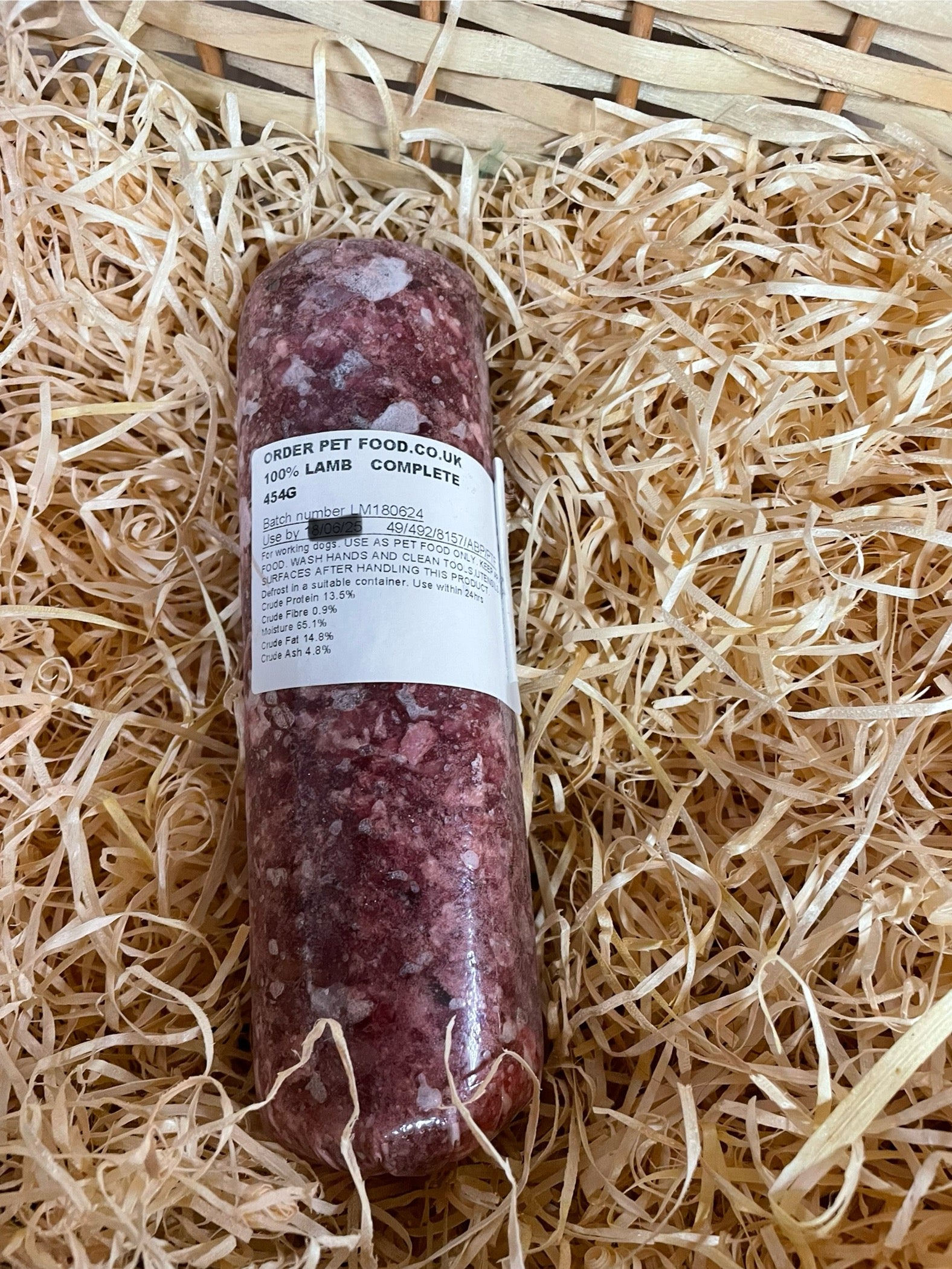 Single protein - 80% lamb meat with 10% offal and 10% bone, mixed into a firm mince. Each roll is approx 454 grams. Contains small pieces of bone. Made by Yorkshire Raw.