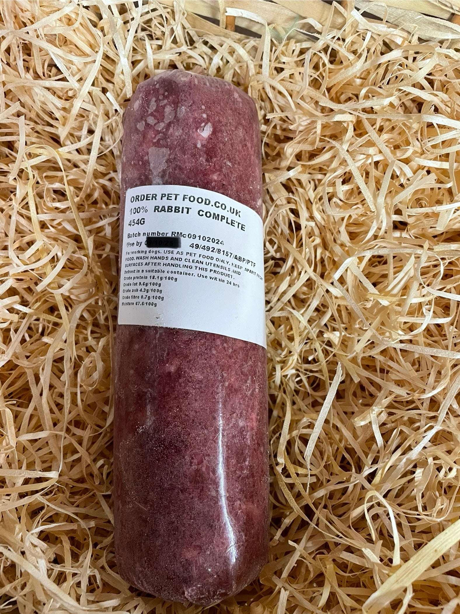 80% rabbit meat (including fur), with 10% chicken offal and 10% bone mixed into a firm mince. Each roll is approx 454g. Contains small pieces of bone. Made by Yorkshire Raw.