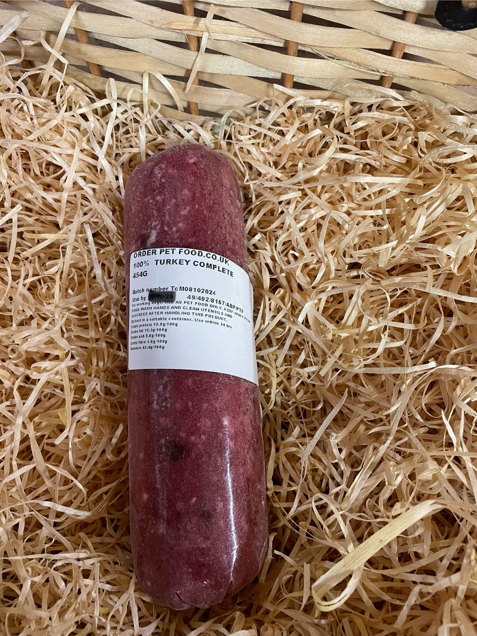 Single protein - 80% turkey meat with 10% offal and 10% bone mixed into a moist mince. Each roll is approx 454g. Contains small pieces of bone. Made by Yorkshire Raw.
