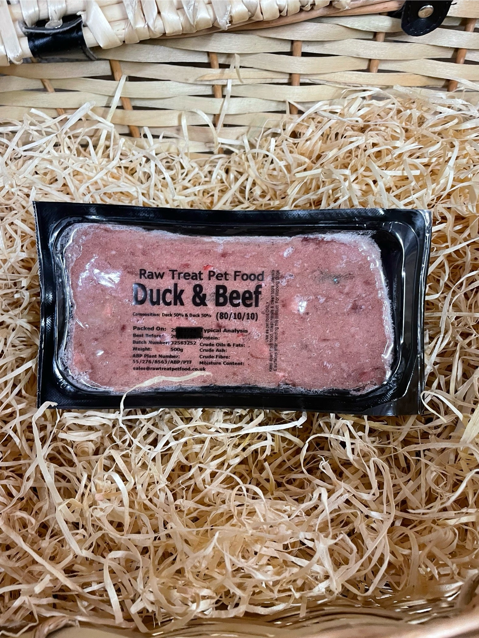 40% Duck Meat and 40% Beef Meat with 10% Bone and 10% Lamb Offal. Each packet is approx 500g. Contains small pieces of bone.
