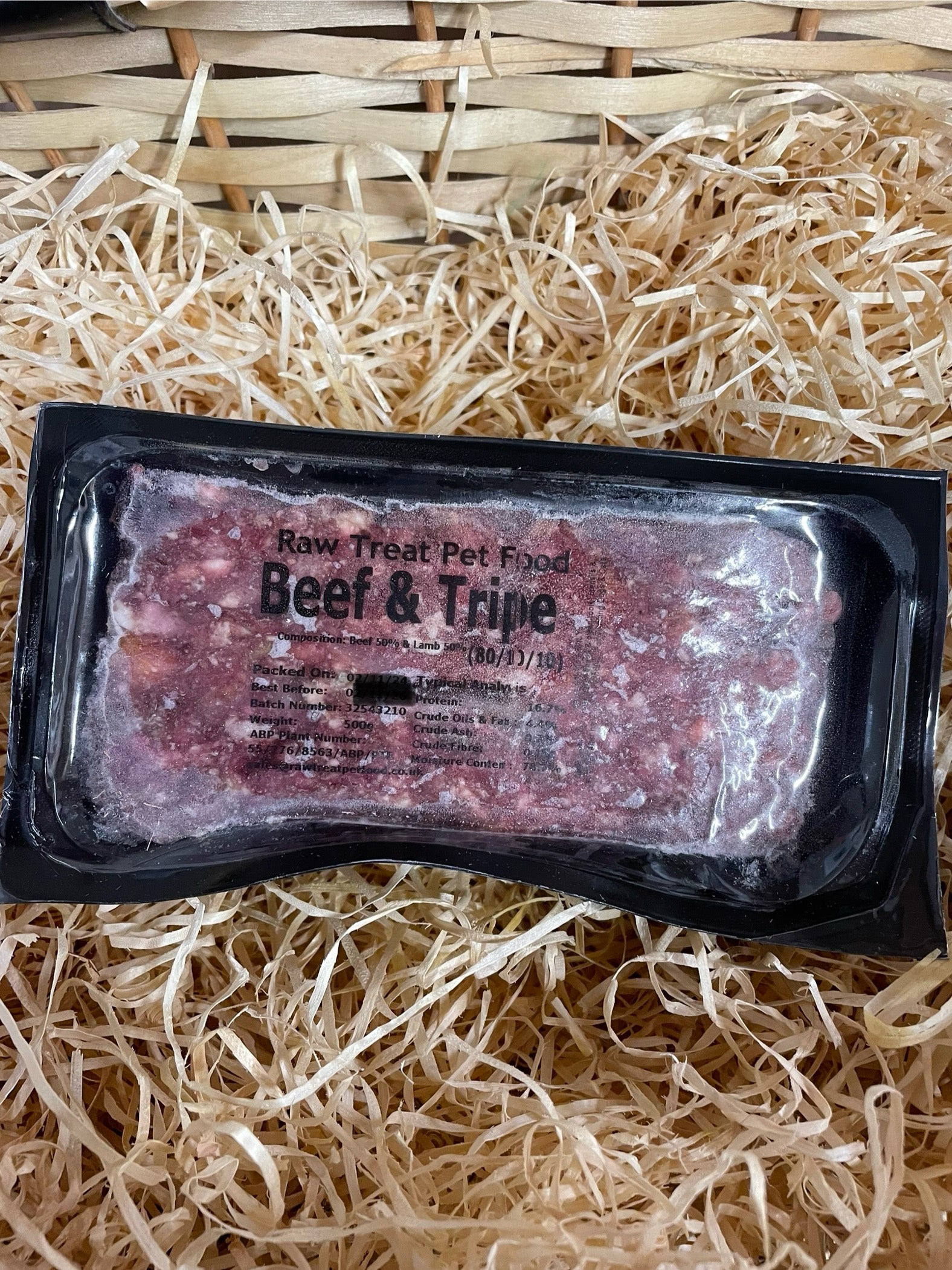 40% Beef Meat and 40% best Lamb Tripe, minced with 10% Bone and 10% Lamb Offal. Each packet is approx 500g. Contains small pieces of bone.