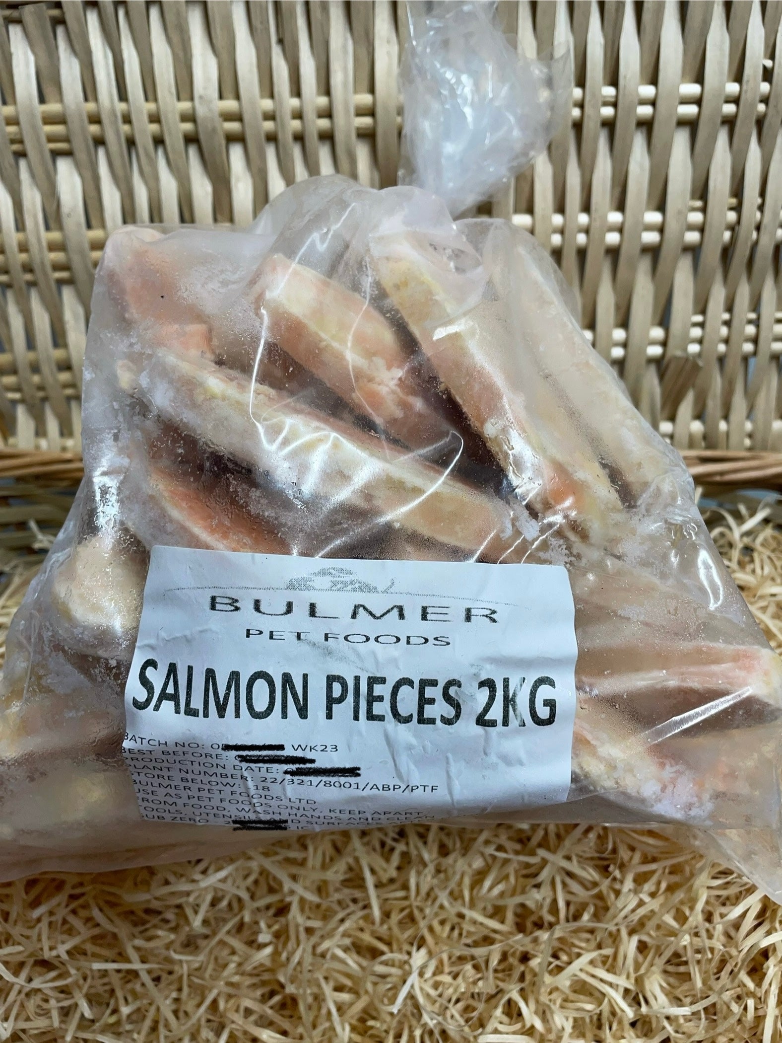 Frozen, raw salmon chunks. In 1kg (approx) or 2kg (approx) packs.