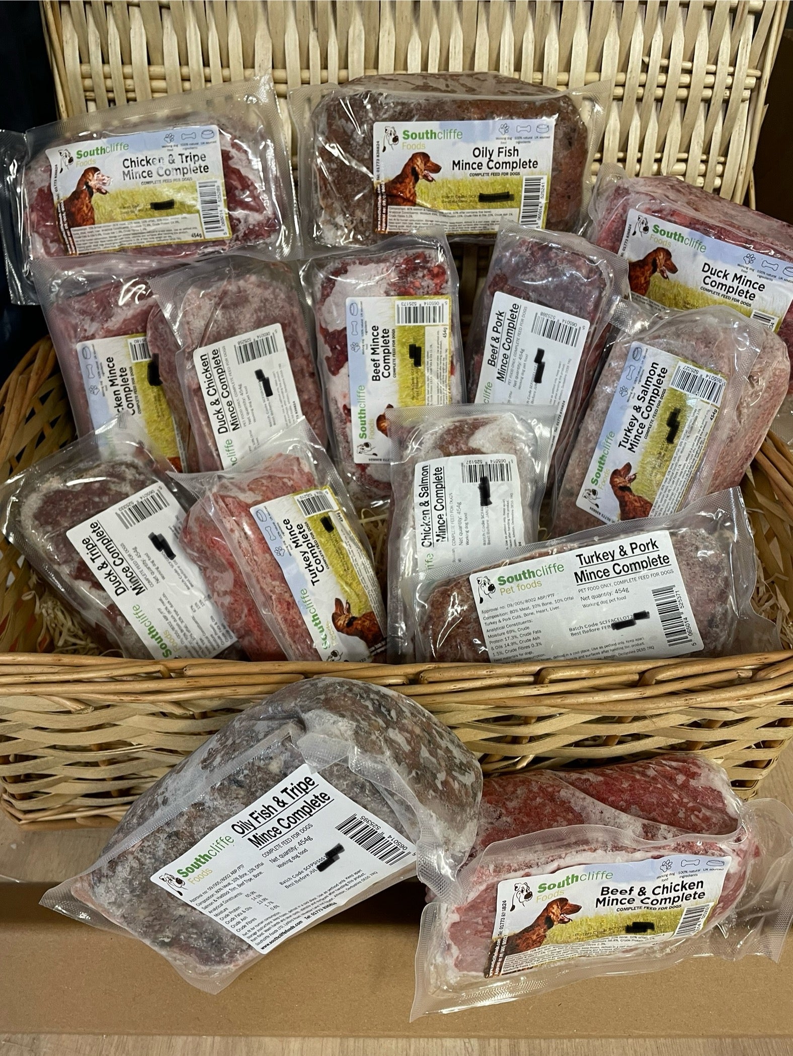 Southcliffe minces are all single protein unless the name suggests otherwise. Proteins include Beef, Beef & Chicken, Chicken, Chicken & Salmon, Duck, Duck & Chicken, Duck & Tripe, Oily Fish, Oily Fish & Tripe, Turkey, Turkey & Salmon, Turkey & Pheasant, Scottish Venison.