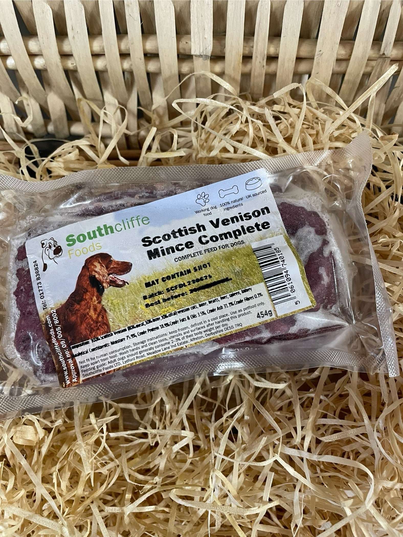 Single Protein - 80% Scottish Venison meat minced with 10% bone and 10% offal. Each pack is approx 454g. Contains small pieces of bone. May contain Shot.