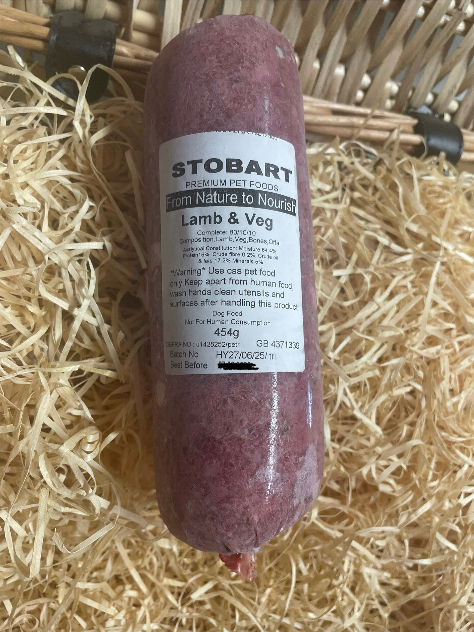 80% Lamb Meat and Vegetables with 10% Bone and 10% Offal. Each packet is approx 454g. Contains small pieces of bone.