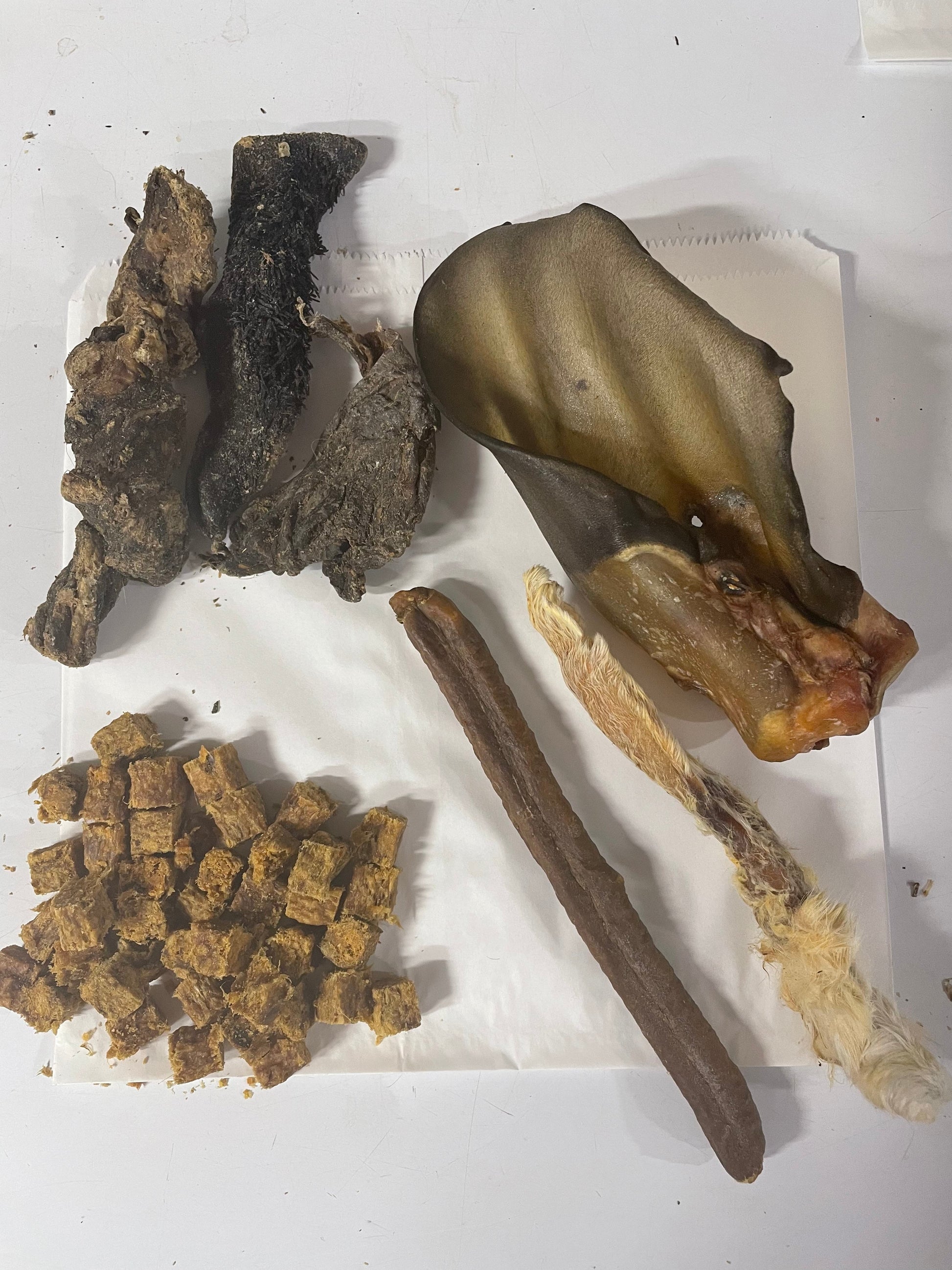 £7.50 Treat Bag: includes 1 Ear (pig or buffalo), 3 Furry Rabbit Ears, 1 Long Sausage (chicken, beef & veg or black pudding); 7 Deli Sausage (liver or turmeric); 1 Dried Pork Kidney; 100g Dried Sprats; 1 Beef Testicle Slice.