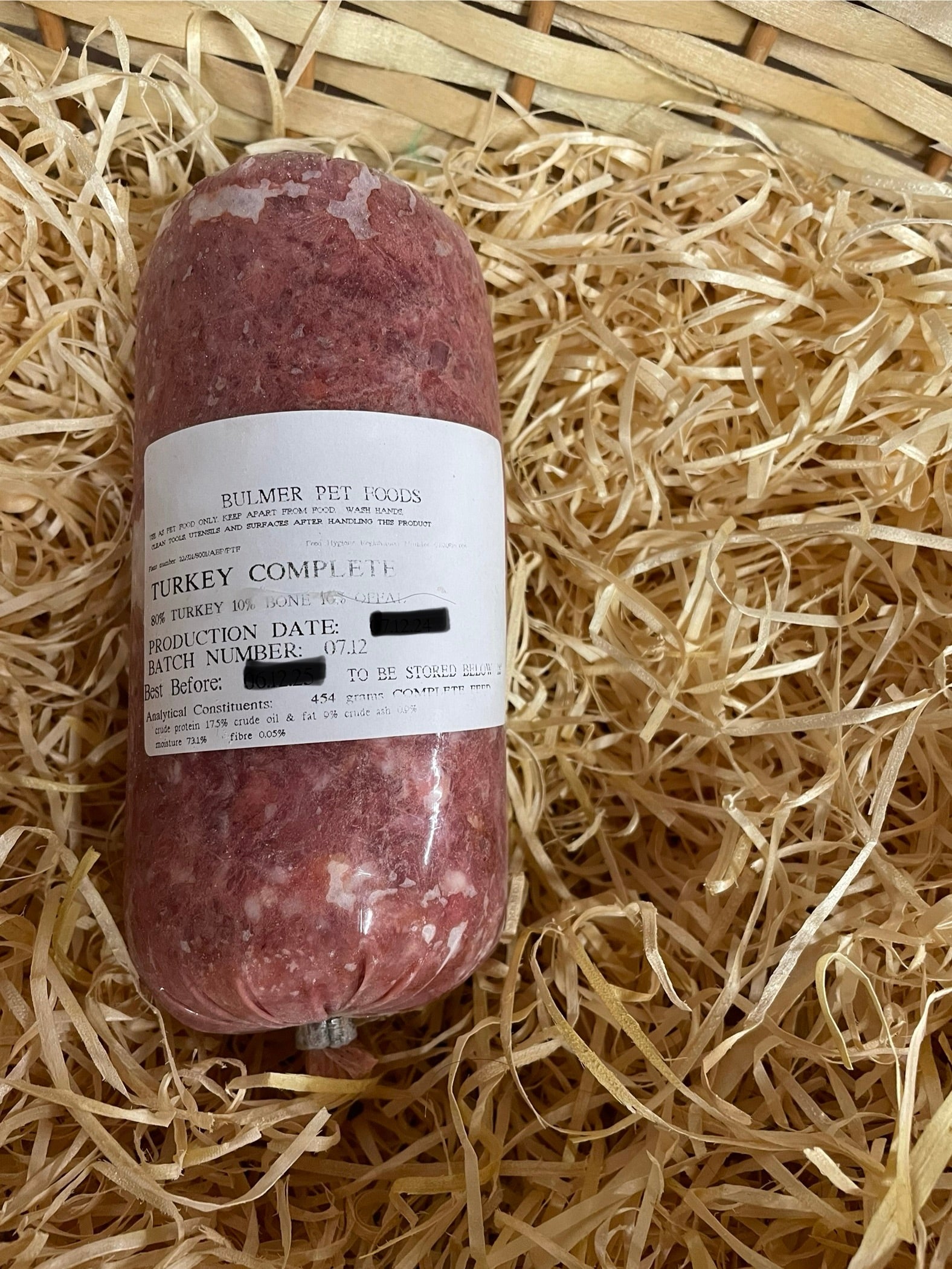 80% Turkey Mince with 10% Bone and 10% Beef Offal. Each roll is approximately 454g. Contains small pieces of bone.