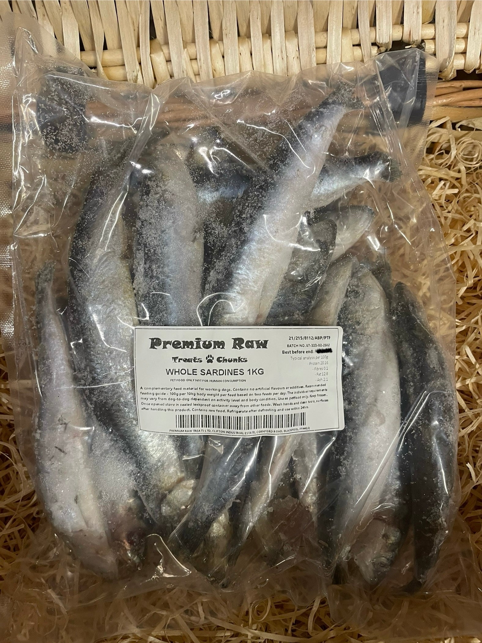 Premium Raw Treat & Chunks Typical Analysis per 100g: Proteins 20.16; Fibres 0.1; Fat 12.8; Ash 2.1.